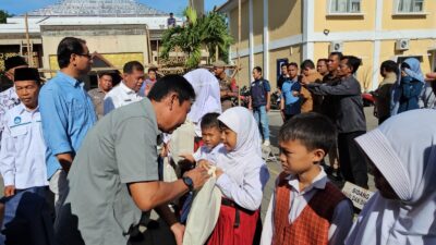 BANJAR BI –  Bhabinkamtibmas Bripka Dedi Wahyudi bersama sama dengan Bhabinsa dan Satpol PP melaksanakana pendistribusian Bantuan dari JPS , Minggu (04/10).