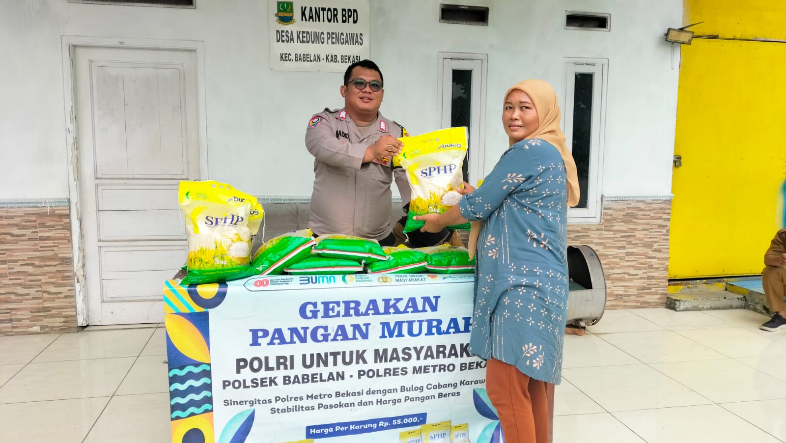 BEKASI, Buser Indonesia ||Dalam upaya mendukung program ketahanan pangan yang dicanangkan oleh pemerintah pusat, Bripka Hadid selaku Bhabinkamtibmas Desa Kedung Pengawas, Polsek Babelan, Polres Metro Bekasi, mengambil langkah nyata dengan membuka stand penjualan beras Bulog murah.