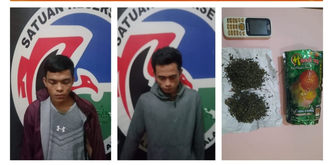 Kedua pelaku didapati memiliki narkotika jenis ganja yang disimpan di dalam kotak sampah dengan dibalut kantung plastik berwarna hijau bekas pakan ikan,” kata Kasat Narkoba Iptu Sutiyoso, SH, MH, MSi.