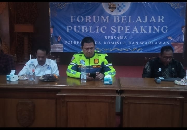 Dalam suasana formal namun dialogis, para peserta mengikuti forum dengan latar belakang spanduk bertuliskan “Forum Belajar Public Speaking Bersama Polres Jepara, Kominfo, dan Wartawan”. Diskusi berjalan aktif dengan pemaparan materi seputar teknik berbicara di depan umum, etika komunikasi publik, serta peran strategis media dalam menyampaikan informasi kepada masyarakat.