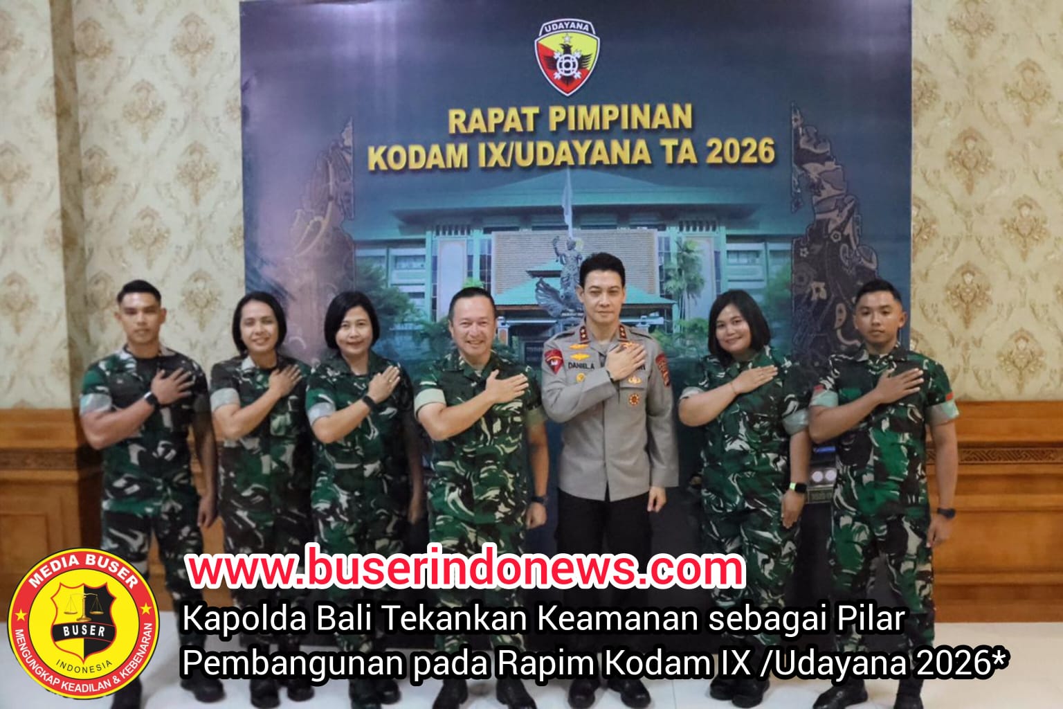 Badung Bali || buserindonews.com — Kapolda Bali Irjen Pol. Daniel Adityajaya, S.H., S.I.K., M.Si., tampil sebagai narasumber utama dalam Rapat Pimpinan (Rapim) Kodam IX/Udayana Tahun Anggaran 2026 yang digelar di Balai Budaya Girinata Mandala, Puspem Badung. Forum strategis ini dihadiri Pangdam IX/Udayana, Irdam IX/Udayana, para Danrem, Dandim, Danramil se-Nusa Tenggara, serta seluruh personel TNI yang terlibat.