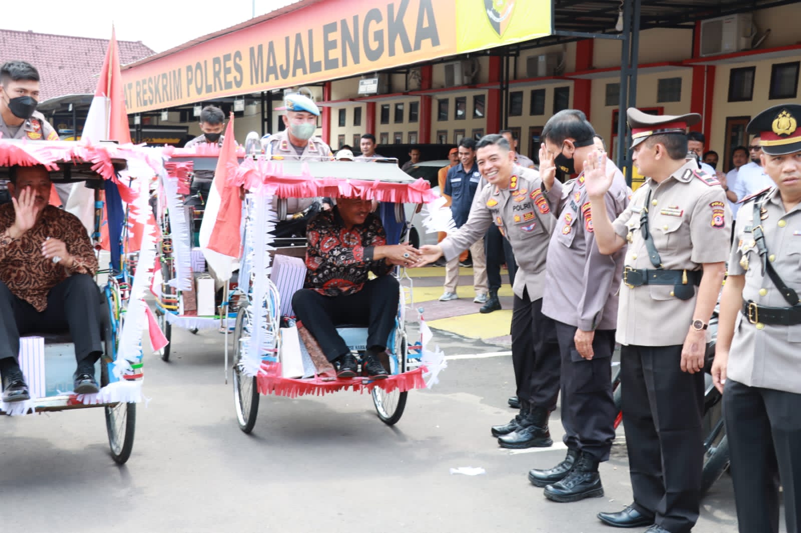Usai upacara Sertijab Para PJU dan Kapolsek, disaksikan Kapolres Majalengka bersama Para PJU Polres Majalengka, sebagai tanda untuk mengantar kepergian 7 anggota Polres Majalengka tersebut mengayuh becak yang di naiki oleh para Perwira yang akan Purnabakti.