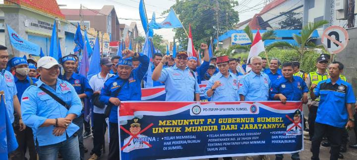 KSPSI Dengan Ratusan Masa Menuntut Revisi Upah Minimum Sektoral Provinsi(UMSP) Di Depan Kantor Gubernur Sumsel.